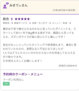 最初は不安で痩せられるのかなと思っていたダイエットも、スタートして約1ヶ月で3kg痩せる事ができ、順調とも言ってもらえ、ズボンのサイズが楽に感じたりと嬉しいです!