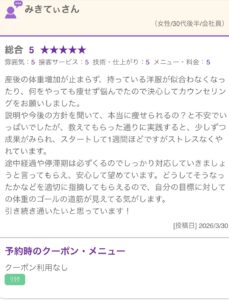 途中経過や停滞期は必ずくるのでしっかり対応していきましょうと言ってもらえ、安心して望めています。どうしてそうなったかなどを適切に指摘してもらえるので、自分の目標に対しての体重のゴールの道筋が見えてる気がします。